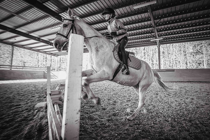 His hooves thundered, ears flicking for her voice, and when he rose over the rail, she rose with him—weightless, suspended between earth and sky.