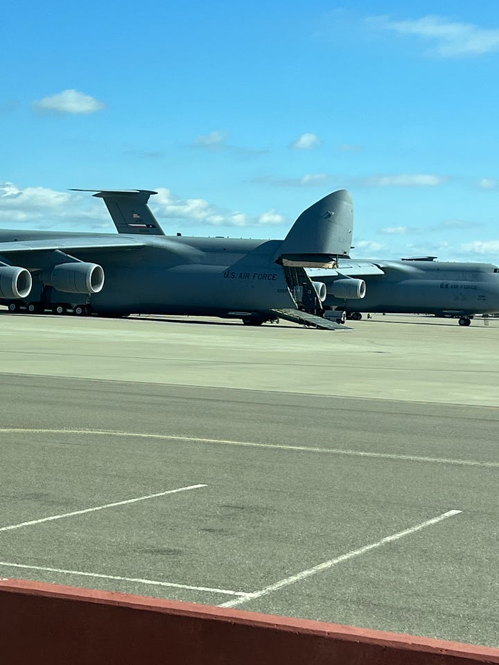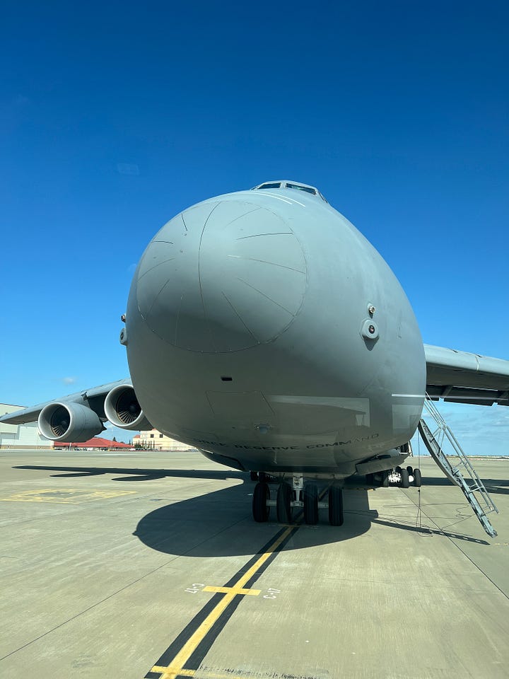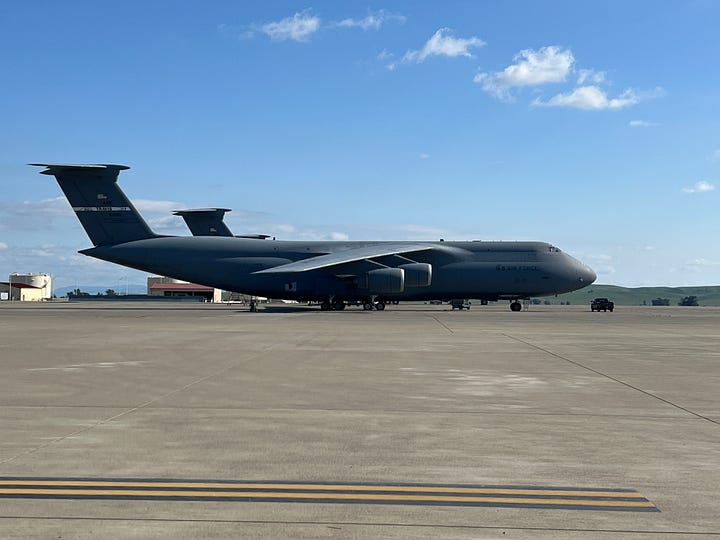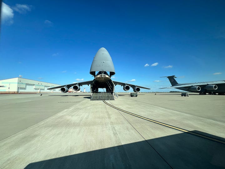 We were issued boarding passes. Our suitcase was tagged and checked. Security was brisk but unburdened—no shoes off, no laptops out. We boarded a bus and rode across the tarmac, past rows of grounded giants, until we reached our aircraft: a C-5 Galaxy, gleaming in the afternoon sun.