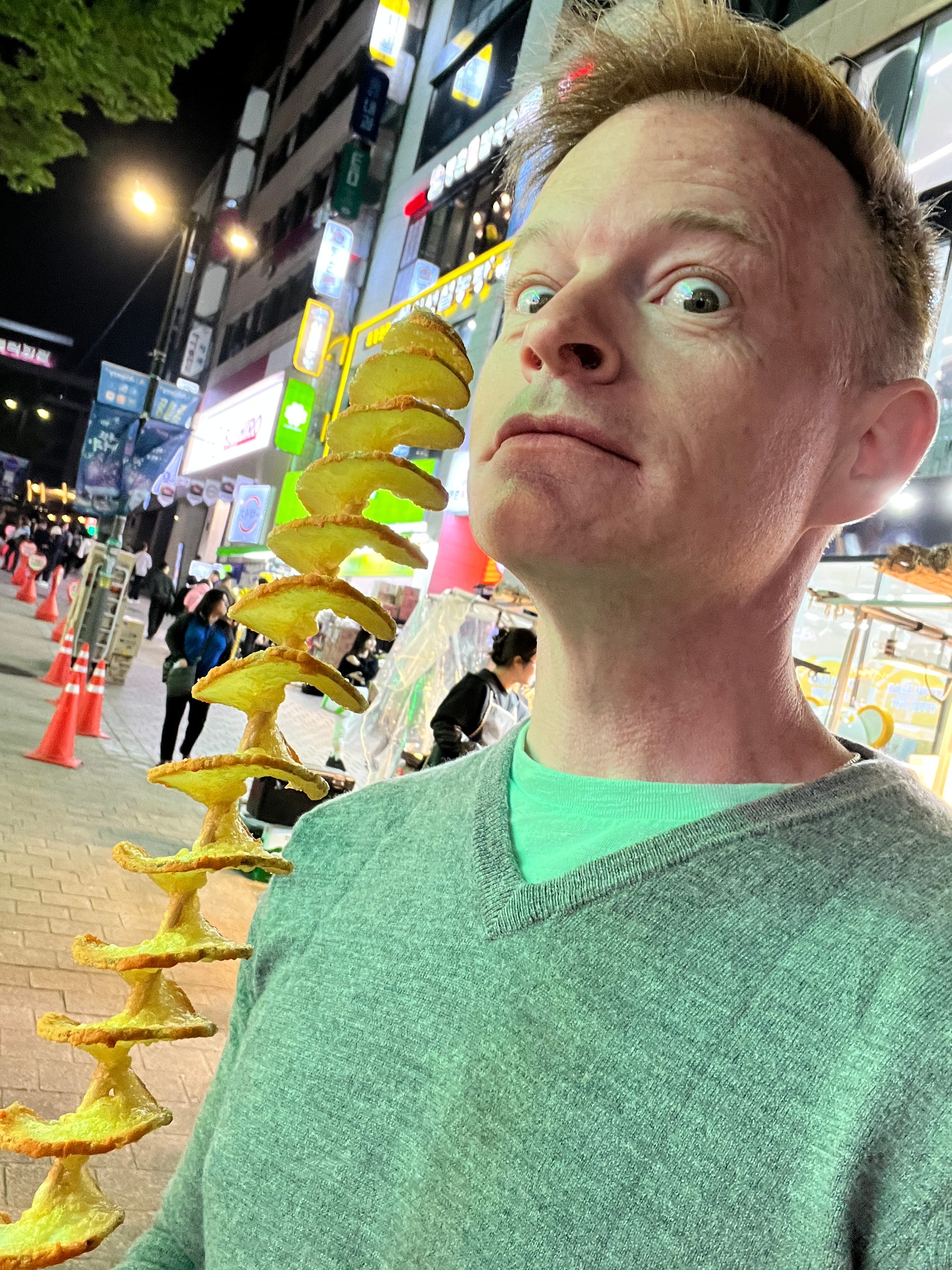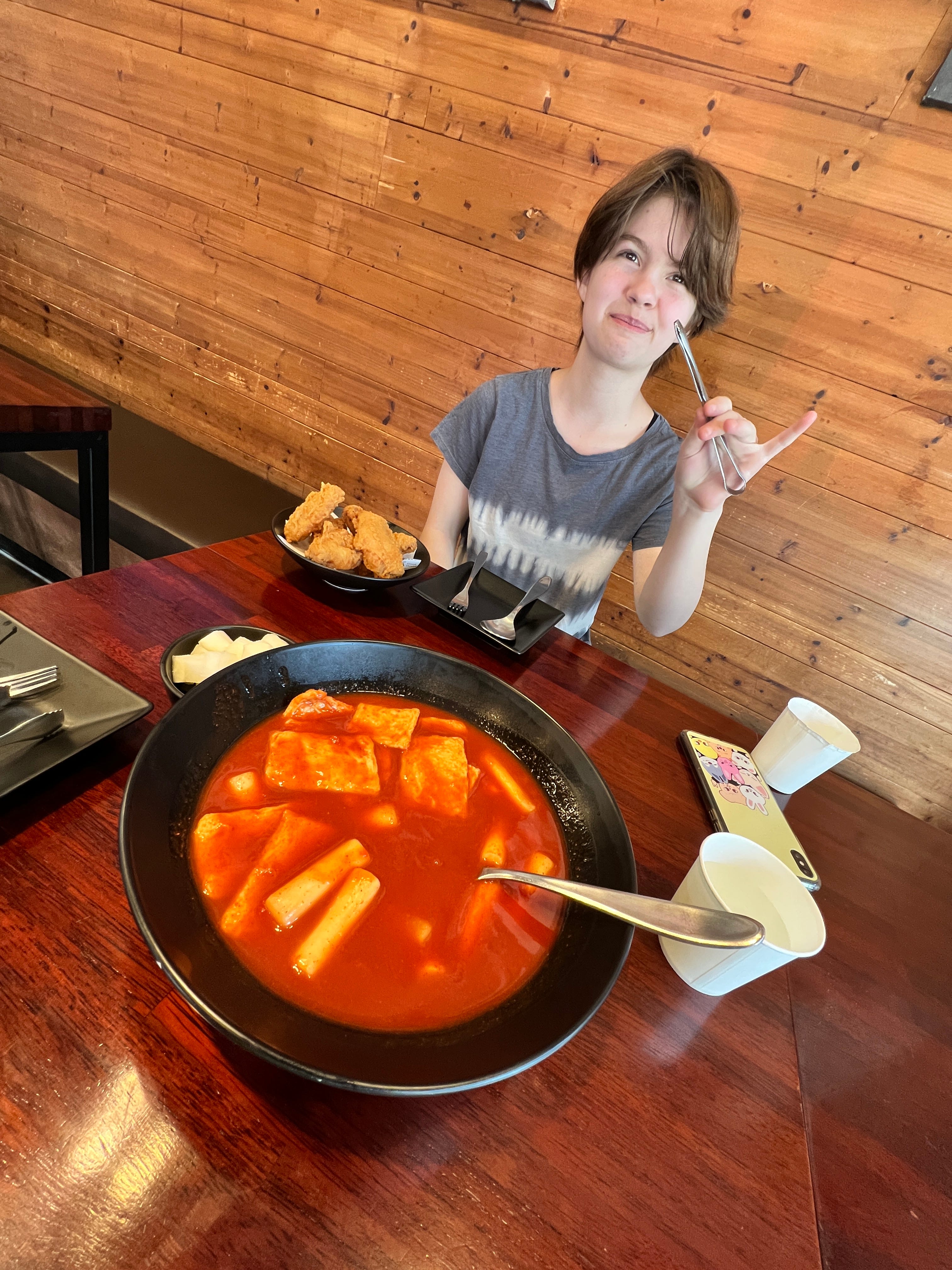 Back in the village, we dropped off the bikes and found a tiny restaurant for lunch. My phone was down to 10%. I ordered tteokbokki—spicy, chewy rice cakes swimming in a red sauce that punched me square in the throat. I loved it.